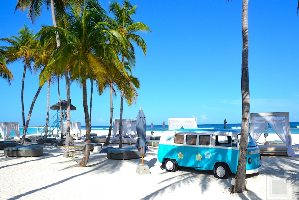 On the island, between the pink and light blue VW Bullys, large lounge furniture, cozy hammocks and loungers covered with white cloths invite you to relax and while away the time. The relaxed vacation feeling is enhanced by light summer beats that immerse the powder-sugar beach in a chilled Café del Mar-style atmosphere, while the DJ in the 1 OAK Beach Club entertains with soft club beats by the pool. For us, this day should never have ended.