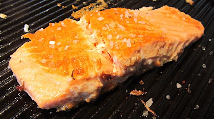 Säubern Sie als nächstes die Fischfilets und würzen Sie die Forellen mit Salz und Pfeffer. Erhitzen Sie etwas Sesamöl in einer Grillpfanne und braten Sie die Filets auf jeder Seite ca.2-4 Minuten, je nach Dicke. Der Fisch soll innen noch glasig bleiben, außen aber eine ansprechende Grillkruste haben.