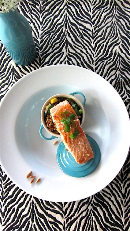 Richten Sie nun den lauwarmen Linsen-Mango-Salat in einem tiefen Teller an und setzen Sie das gegrillte Fischfilet oben auf. Garnieren Sie mit etwas Frühlingszwiebel-Grün.