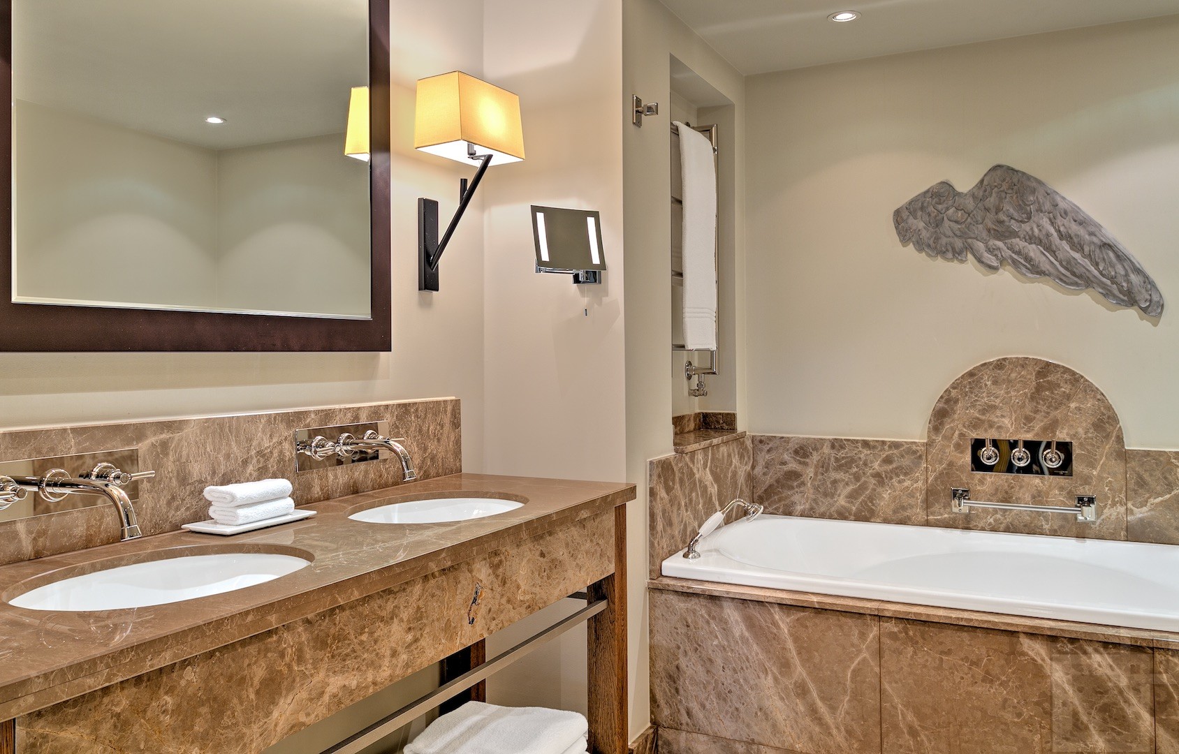 The gray or sandstone-colored marble bathrooms are all very spacious and some have separate showers with