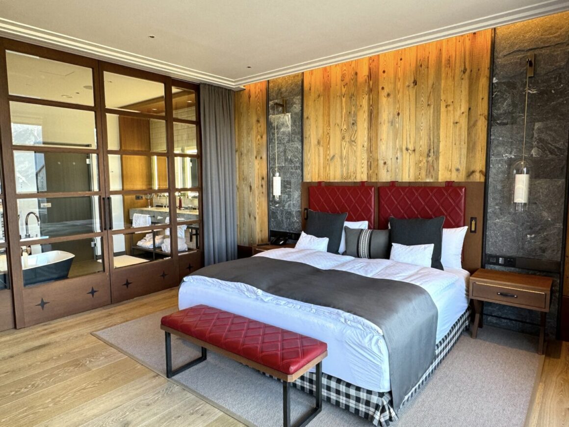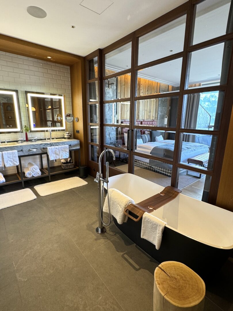 Absolutes Highlight ist unsere Panorama-Suite mit knapp 80m2. Sanfte Farben, warmes Holz und hochwertigste Materialien sorgen für ein elegantes und cozy Ambiente. „Zwei Nächte sind definitiv zu kurz“, denke ich mir als ich den Blick über unser Refugium streifen lasse. Äußerst großzügig sind das Ankleidezimmer und das Bad mit separater Dusche und Toilette sowie einer freistehenden Badewanne. Selbst von hier kann man durch die bodentiefen Glastüren über den Schlaf- und Wohnbereich in die Bergwelt blicken.