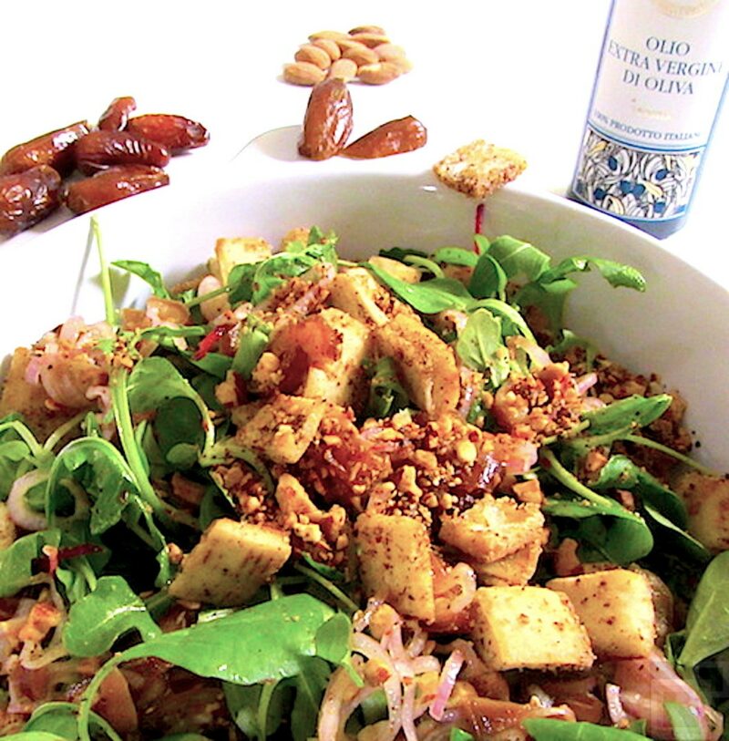 To serve, place the salad leaves in a large bowl and add the pita and almond mixture, dates, onions, the remaining oil, lemon juice and a pinch of salt. Mix carefully and season to taste again – then serve immediately.