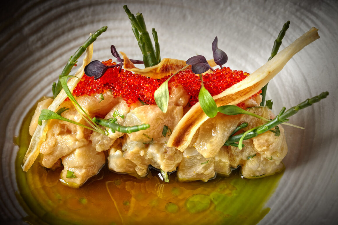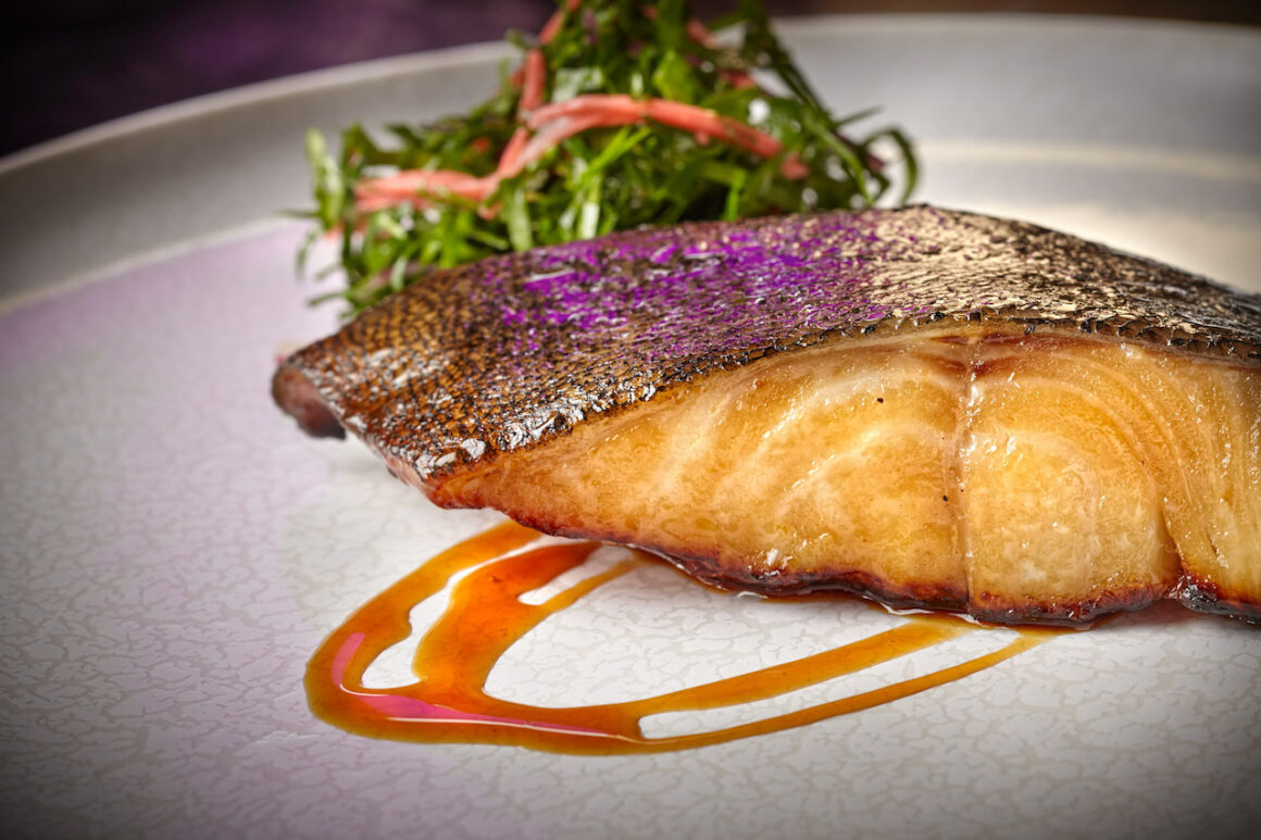 Beim ersten Bissen meiner Vorspeise – Streifenbarsch-Ceviche mit Aji Amorillo, Koriander und leuchtend rotem Topiko (Kaviar vom fliegenden Fisch) – verstehe ich, weshalb der Nikkei Style international so angesagt ist. Die Vorspeise ist Kunst auf dem Teller und im Mund! Eine halbe Stunde werden die dünnen Scheiben vom Fisch in Sesamöl und Zitrone mariniert bevor sie mit knackigen Schwarzwurzelchips, Algen und rotem Basilikum auf den Teller kommen. Frisch, leicht, perfekt ausbalancierte Kräuter und Gewürze, der Fisch mit einem Hauch Meeresbrise – es gibt kein besseres Gericht für den Sommer.