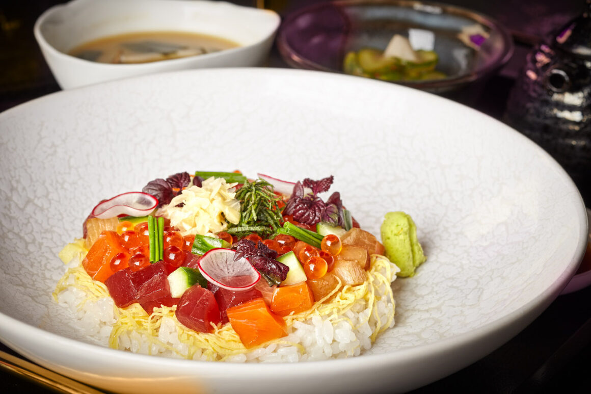 Durch die warmen Farben, die geschickte Beleuchtung und dank der gemütlichen Möbel bleibt der Raum intim und cosy. Stylish ist die offene Küche, samt 3-D-Kunst, in der Gäste den Küchenakrobaten jederzeit über die Schulter schauen können. Besonderer Hingucker ist der Robata Grill, ein traditioneller japanischer Holzkohlegrill, an dem der Hummer über offenem Feuer gegrillt wird. Einen zweiten Fokus bildet die nach zwei Seiten offene Bar. Wer sich hier vor dem Essen einen der Signature Drinks, wie den Fountain of Youth holt, der dank Shochu (japanischer Schnaps) lebensverlängernde Wirkung haben soll, kann bis zum Dinner in einladenden Sofa-Ecken relaxen oder auch gleich am Tresen sitzen bleiben – dort werden, typisch japanisch eben, auch Speisen serviert.