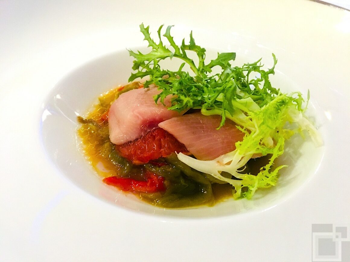 The main course is a steak with a delicious sauce. The French classic demi-glace is considered by many to be the queen of sauces. And Ramon García has also succeeded perfectly. It beautifully accompanies the meat, which is cooked to perfection. Pure pleasure that melts in the mouth, in the best company with spinach and green asparagus. Refined addition: a quince jelly for a hint of fruit.