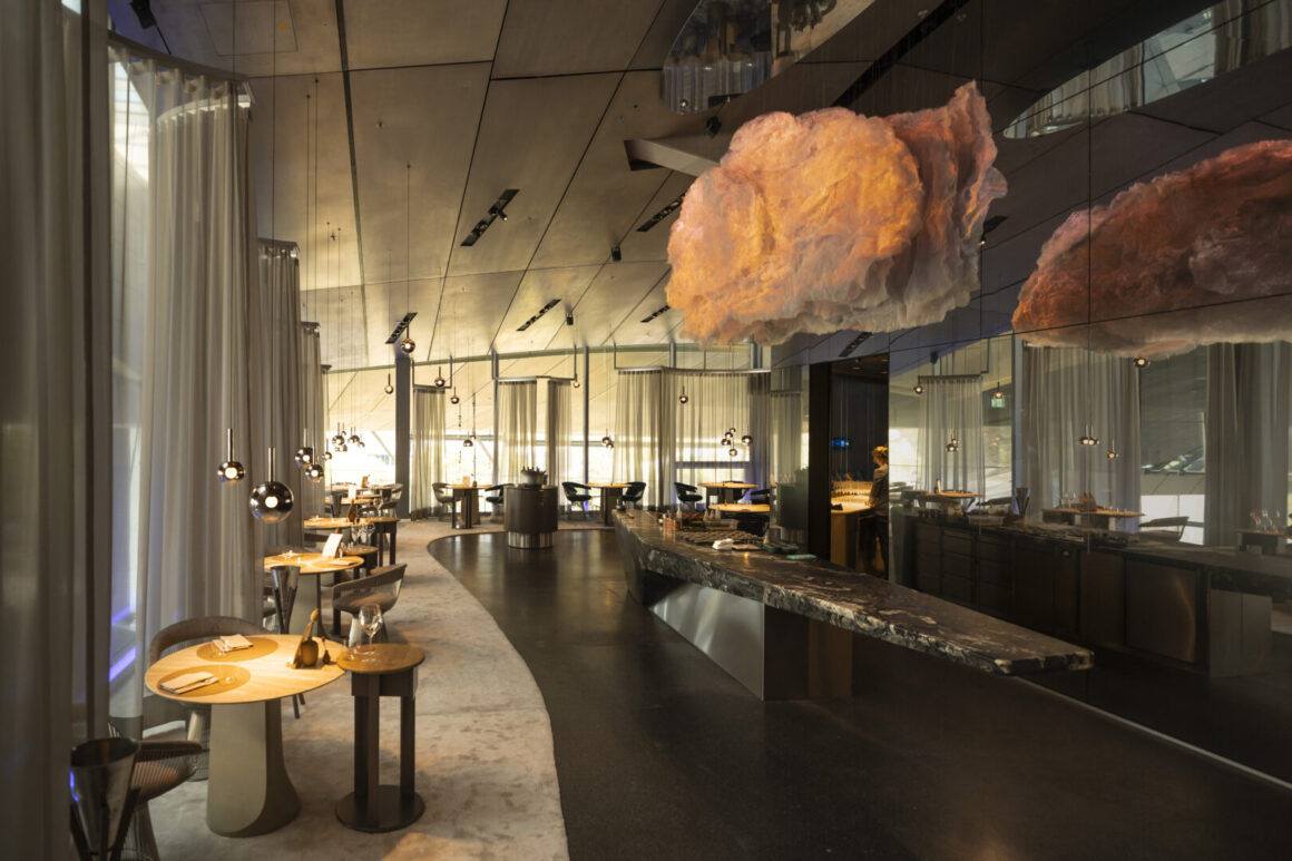 Wer noch das alte »Esszimmer« kennt, kommt aus dem Staunen nicht heraus. Das Zusammenspiel aus Licht, Farbe und Raum bereitet dem einmaligen Fine-Dining-Erlebnis im »The Cloud by Käfer« die perfekte Bühne. Ein echter Eye-Catcher ist die Installation einer großen Wolke aus transparentem Material über dem großen Monolithen aus Titanstein mitten im Restaurant, auf dem den ganzen Abend live gekocht wird. Mit blauem und goldenem Licht sorgt sie für ein natürliches Lichtspiel vom sanften Morgenblau bis zur Golden Hour am Abend. Persönlich liebe ich auch die Erinnerungswand am Eingang, bestückt mit Mitbringsel und Erinnerungsfotos von Jens‘ Reisen. Sie gibt einmal mehr das Gefühl bei Jens, Mona und ihrem Team zuhause beim Essen zu sein. Und dahin komme ich gerne bald wieder.