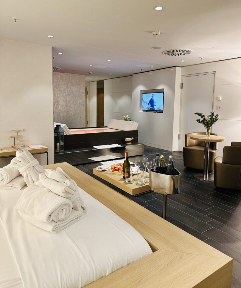 Für alle, die gerne ungestört wellnessen steht die Private Suite bereit. Mit exklusivem Dampfbad, Whirlpool, einer Erholungslounge und Sauna. Frische Snacks, Wasser und Bubbles inklusive.