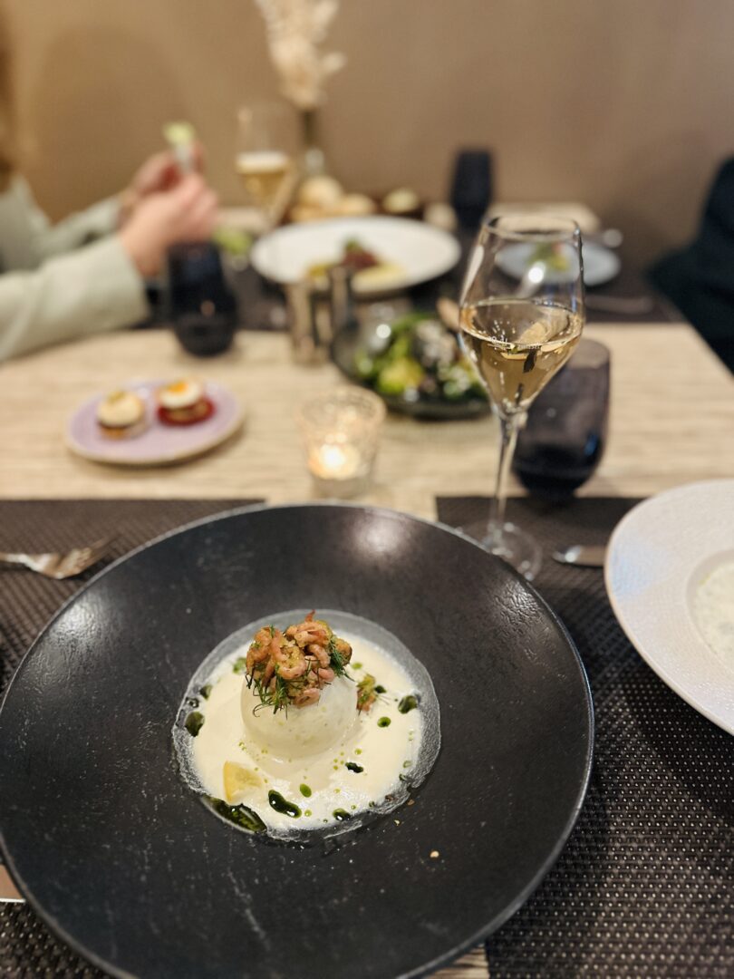Ein kurzer Blick auf die wechselnde Karte und wir wählen neugierig das Elbphilharmenü mit 5 Gängen inklusive Weinbegleitung. Chefkoch Cameron White präsentiert hier seine aktuellen Lieblings-Leckerbissen. Während wir eine moderne Interpretation des klassischen Hechtkloß mit Büsumer Krabben nach einem Rezept vom Camerons Oma oder Hamburger Tapas schlemmen, empfiehlt der freundlich-charmante Service handverlesene Weine zu den unterschiedlichen Gängen. Besonders begeistert sind wir vom Sauvignon Blanc „Ein Tag am Meer“ von Hammel und Cie. Erfrischend fruchtig und elegant-duftend im Glas. Perfekt zum Hecht!