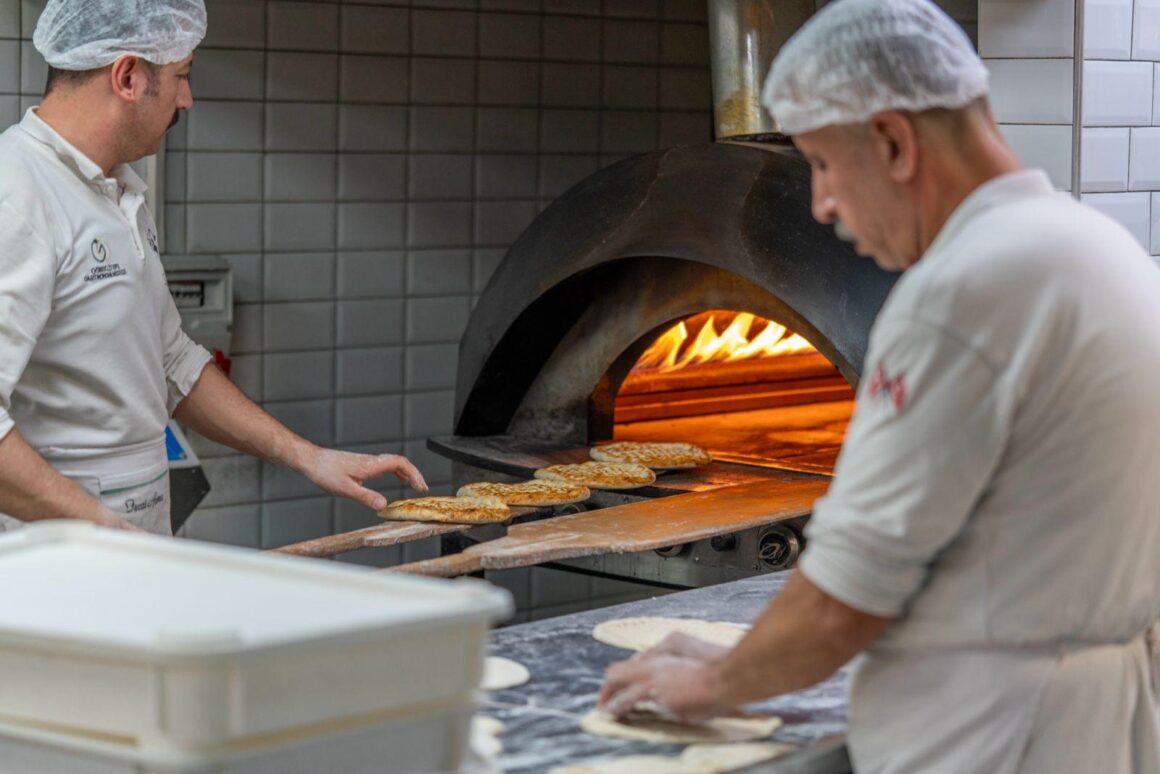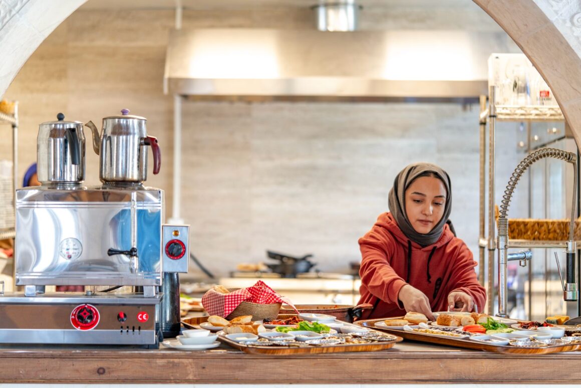 Die Straßenrestaurants im Basar sind zwar urig, aber wer Wert auf Stil, Auswahl und Hygiene legt, sollte sich in den moderneren Stadtvierteln umsehen. Unser Freund Mehmet Ali, einer der besten Kenner der lokalen Szene, empfiehlt uns das frisch eröffnete Göbeklitepe Gastronomi Merkezi. Das Restaurant mit dem sperrigen Namen befindet sich in der obersten Etage eines dreistöckigen Neubaus in den nordöstlichen Ausläufern der Stadt, etwa 15 Minuten vom Stadtzentrum entfernt. Es handelt sich um ein gemeindeeigenes Kulturzentrum mit Bibliothek, Konferenzsaal und einer Ausbildungsstätte für angehende Köche – das eingelöste Wahlversprechen des Bezirksbürgermeisters. Ich kann mir kaum vorstellen, dass sich in dieser unspektakulären Umgebung ein exquisites Restaurant befinden soll. Hellhörig werde ich erst, als ich erfahre, dass man 1-2 Tage im Voraus reservieren muss, um überhaupt einen Tisch zu bekommen. Dank Mehmet Alis Verbindungen werden Ömer und ich aber schon erwartet, als wir aus dem Aufzug steigen. Sofort geht es in die zum Restaurantraum hin offene Küche. Alle Mitarbeiter tragen wie wir Besucher übrigens auch Haarhauben und Überziehschuhe.