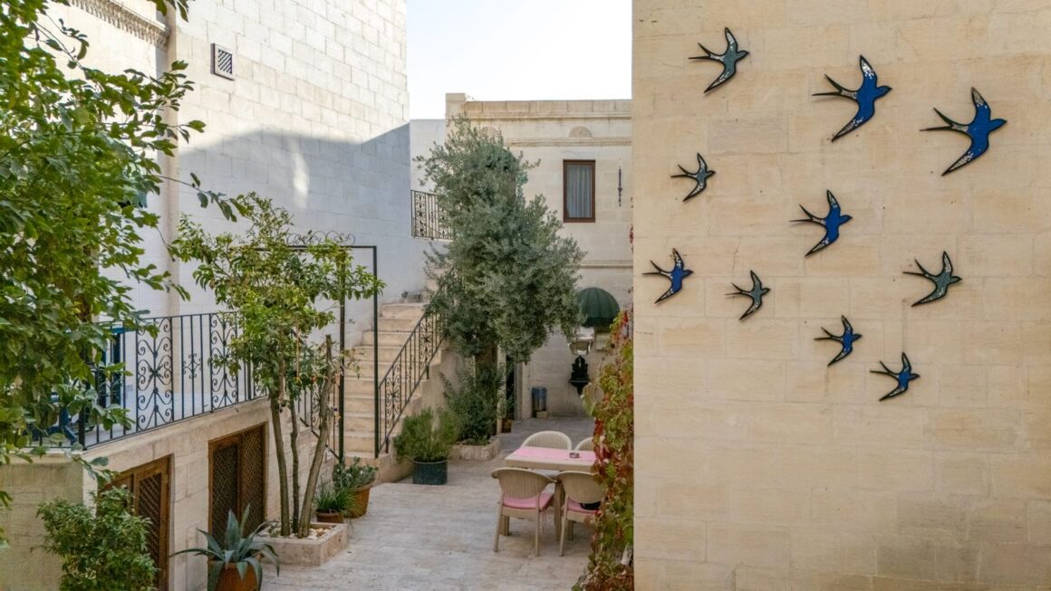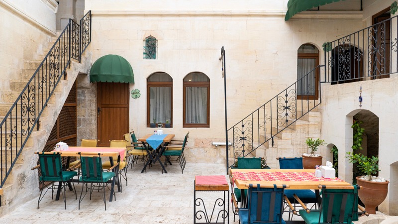 Traumhaft ist der mit Oliven-, Orangen- und Granatapfelbäumchen bewachsene Innenhof traditioneller Rückzugsort und Treffpunkt in einem. Das scheint auch für sämtliche Singvögel von Urfa zu gelten, die dem Frühaufsteher bereits vor Sonnenaufgang ein unerwartet vielstimmiges Konzert geben. Sofern die klimatischen Bedingungen es erlauben – das heißt etwa neun Monate im Jahr – wird jedem Gast im Innenhof ein ausladendes, mit regionalen Spezialitäten angereichertes Frühstück serviert absolut empfehlenswert!