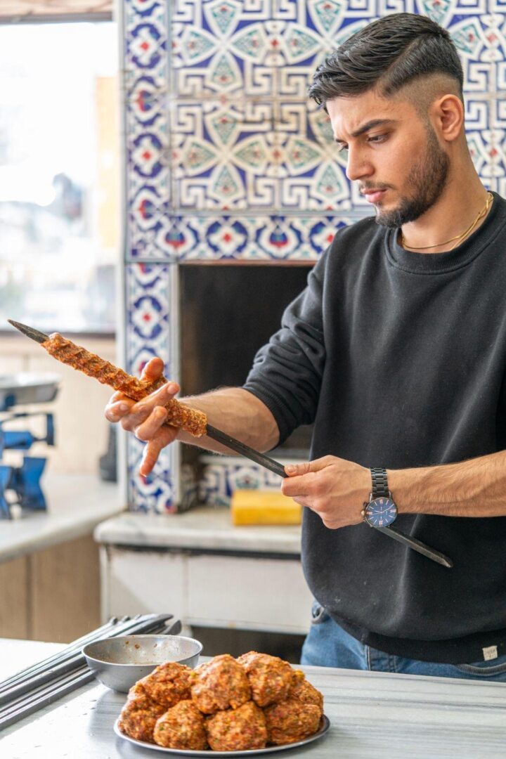 Meister Cevdet ist seit über 60 Jahren erster Chefkoch und Restaurantbetreiber am Platze. Die väterliche Tradition führen drei Söhne fort, die inzwischen jeder seine eigene Filiale betreiben. Wir entscheiden uns für das kleine, ruhige Cevdet Usta in der schmalen Gasse hinter dem Haupthaus. Vorfreude ist bekanntlich die schönste Freude, und so beobachten wir ausgiebig, wie die flachen Kebabspieße gekonnt mit der Ha?ha?-Mischung umhüllt werden. Das bereits am Morgen zubereitete Hackfleisch wird dafür mit einer frisch gehackten Gemüsemischung verknetet, die aus mit dem Wiegemesser zu millimeterkleinen Stückchen zerhackten scharfen roten und grünen Paprika, frischem Knoblauch und Petersilie besteht. Auf Eichenholzkohle werden die Spieße schließlich gegrillt. Zum Ha?ha?-Kebab gibt es aufgeschäumtes Ayran (gesalzenes Joghurtgetränk) und bostana, einen mit süßsaurem Granatapfelextrakt gewürzten Salat. Guten Appetit!