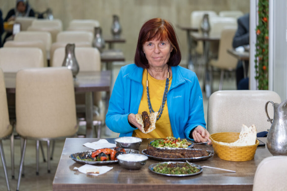 Ich bewundere die Bäcker am offenen Ofen, wo Pita und Lahmacun bereitet werden, und ein Dutzend weitere Köche und Gehilfen, die am riesigen Holzkohlegrill, an Friteusen, Hackbrettern und Kochtöpfen werkeln. Angesichts von so viel dynamischem Treiben schwindelt mir fast ein wenig. Nachdem die junge Köchin Sara mich im Schnelldurchgang über alles Wissenswerte informiert hat, werden wir in den modern eingerichteten Restaurantbereich entlassen, wo man uns ein paar echte Spezialitäten aus Urfa serviert. Als Apéritif gibt es eine säuerliche Limonade aus koruk (unreifen Trauben) köstlich! Auf Kosten des Hauses wird gegen den ersten Hunger allen Gästen eine kleine Auswahl an Vorspeisen serviert, unter anderem Lebeni, eine erfrischende kalte Joghurtsuppe, und aya köftesi, eine Art kalter vegetarischer Frikadellen.