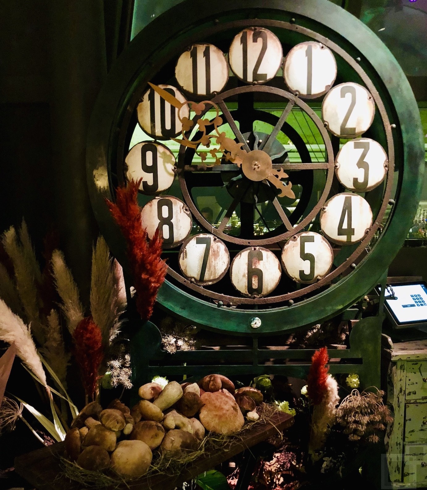 Etwas versteckt liegt die Tür zu den separaten Aufzügen, die uns in Windeseile in den bunten Gastro-Tempel katapultieren. Oben angekommen tauchen wir ein in Vladimir’s Wunderland und staunen nicht schlecht, als wir zunächst an einem Mannshohen Kaviar-Kühlschrank und gegenüber an mächtigen Aquarien mit Austern und riesigen Königgskrabben vorbeikommen. Vorbei geht es an der berühmten Uhr aus Alice im Wunderland, die hier als Brot-Station dient, die Treppen nach oben. Dort eröffnet sich ein immenser Rokoko-Speisesaal mit üppigstem Dekor, plüschigen Sofas, einer großen Bar und goldfarbenen Kissen. Viel Bling-Bling – aber es passt und macht mächtig Spaß! Wirklich Glück haben wir bei unserem Tisch in der Glaskuppel mit Blick über die ganze Stadt.