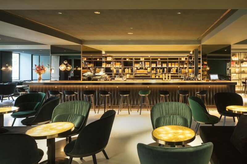 The opulent Romy chairs, elegant cocktail chairs from the 1950s, and the sofa benches, lavishly upholstered in green velvet, invite you to enjoy and relax. The shimmering furniture, the luminous table surfaces and the illuminated bar create a casual coziness at any time of day.